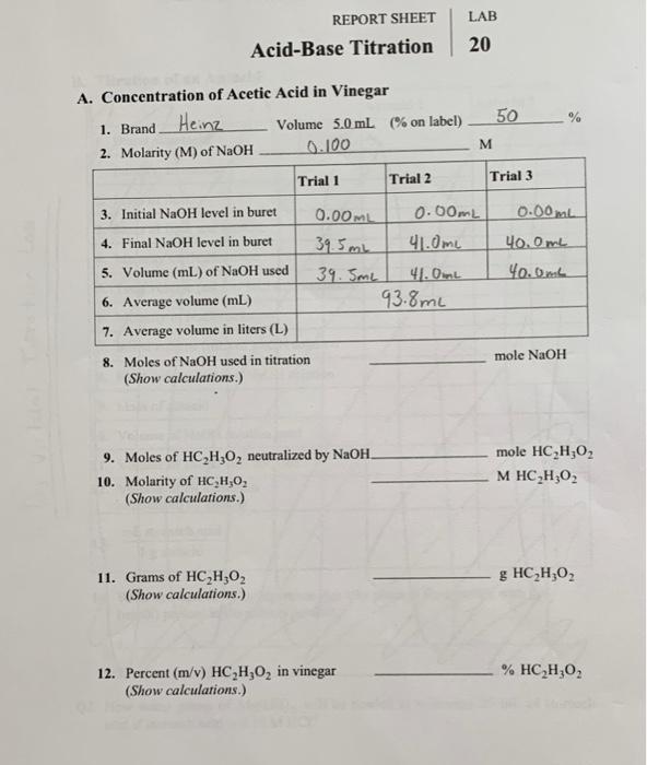 Solved Lab Report Sheet Acid Base Titration 20 50 A Chegg Com